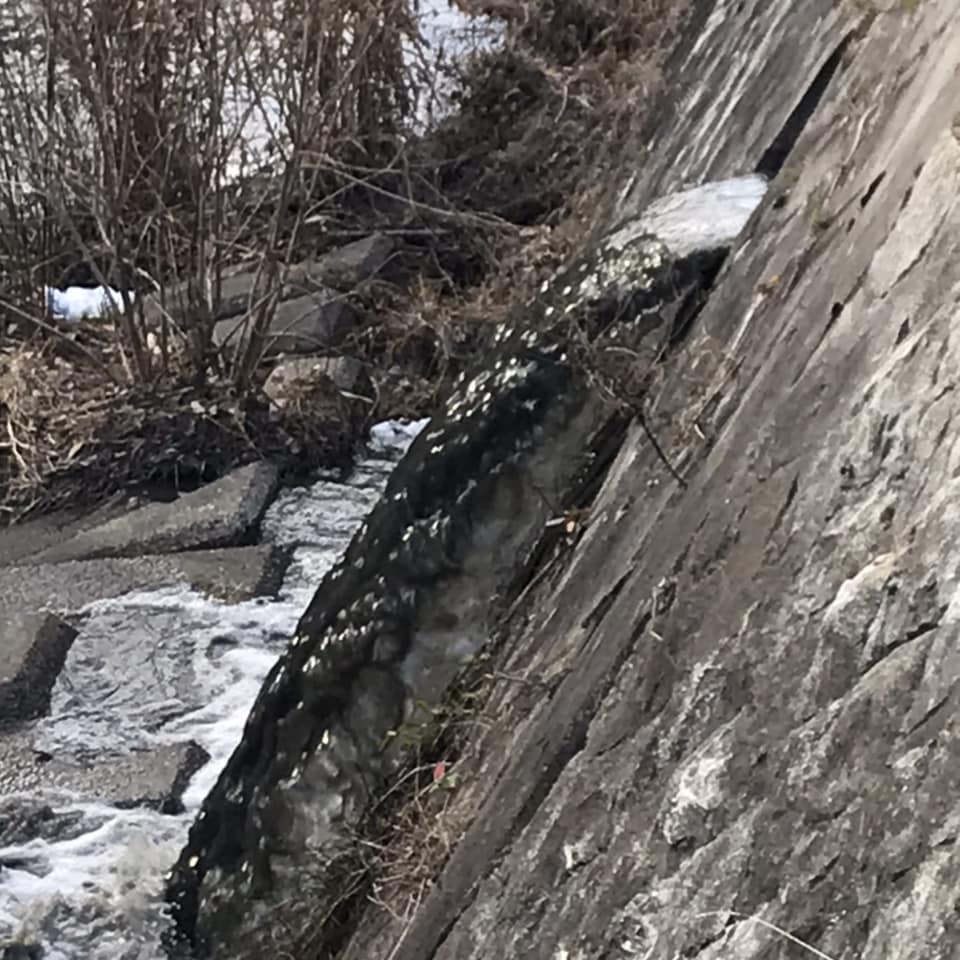 そして、撹拌された泥を消防ポンプに繋いだホースで噴射した水とともに下流に流しました。放流先となる河川を見に行くと黒々とした濁水が勢いよく流れていました。