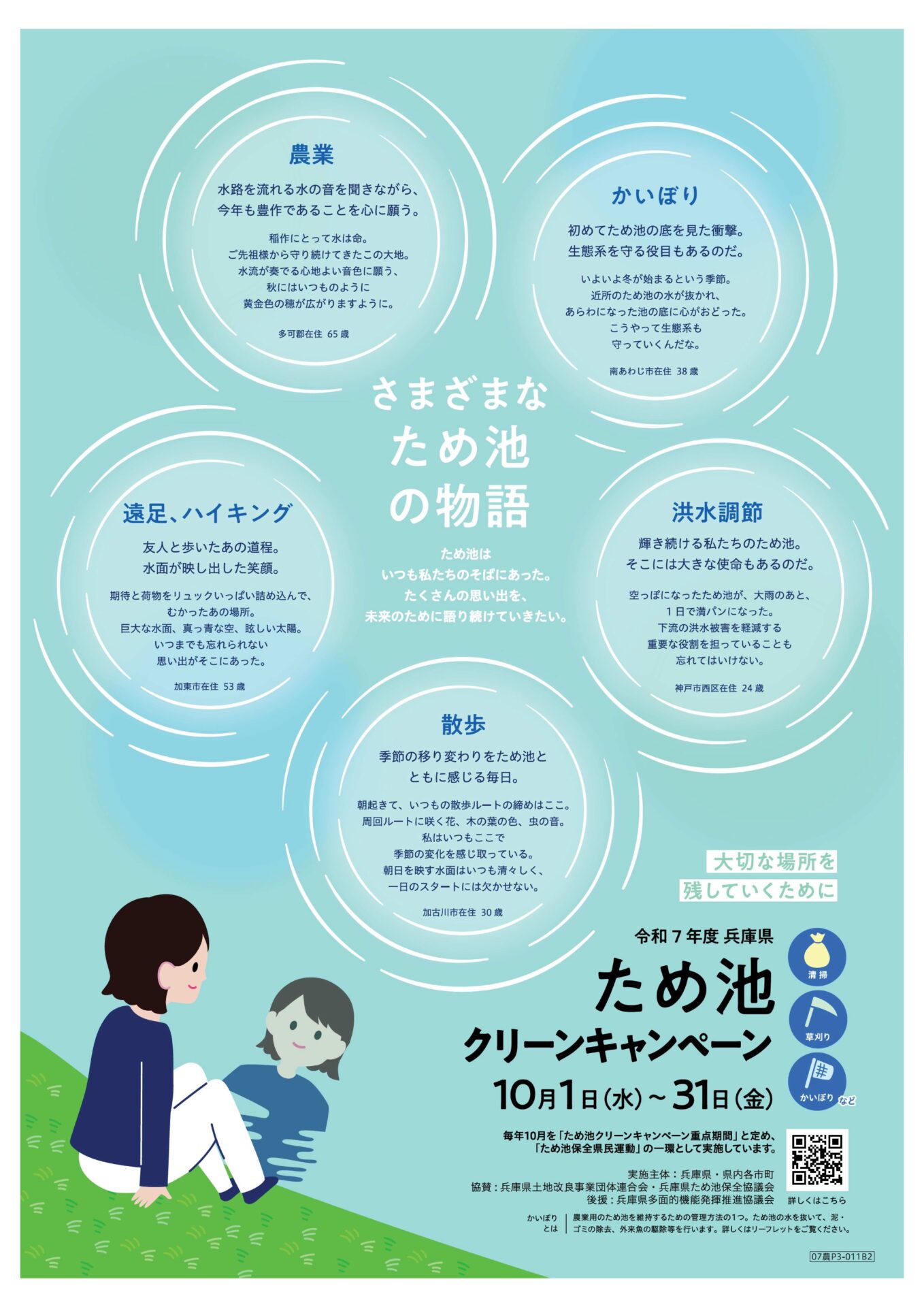 令和7年度のポスター、リーフレットは「ため池との関係性」というテーマで、それぞれの「ため池の物語」を振り返り、また「新たな物語」を作って頂きたいとの願いを込めて作成しました。