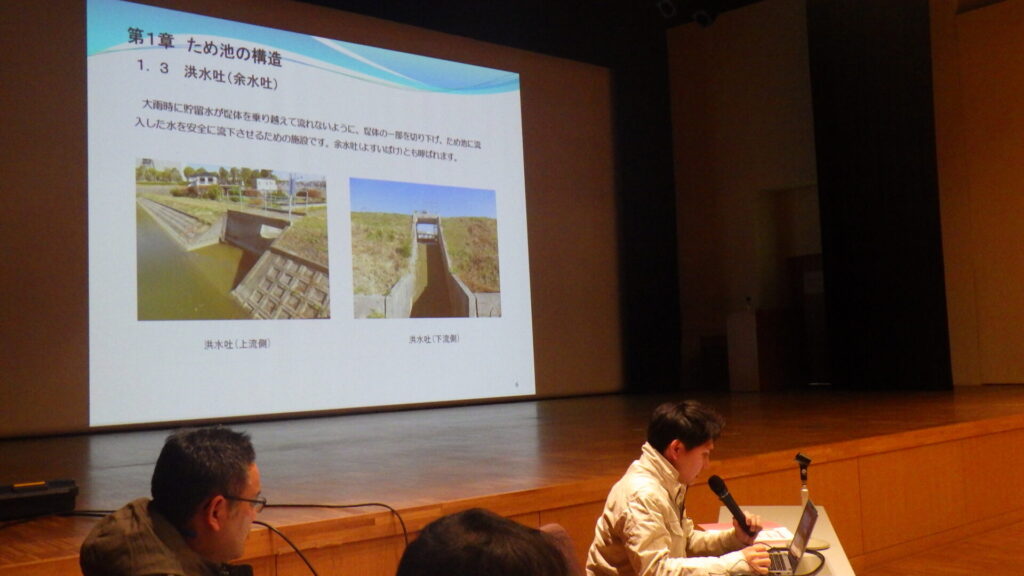 続いて、ため池保全サポートセンターから「ため池管理マニュアル」に基づき、「ため池の点検と保全管理」についての詳しい説明が行われました。