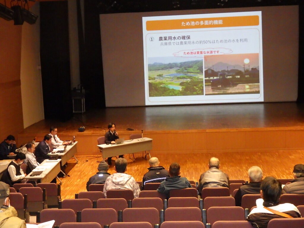 初めに、兵庫県より「ため池保全県民運動」について、県内での取り組み内容をご紹介いただきました。