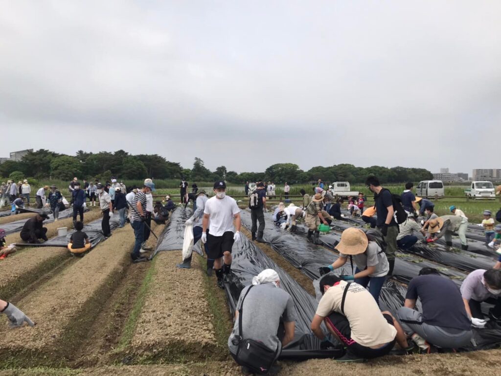 清掃後は池に隣接する畑で、JA加古川南の協力を得てサツマイモの苗を植え付けました。参加者が直ぐに植え付けできるよう、事前に新在家水利組合が準備してくださってたようです。感謝!参加者は畝立てされた畑に、黒のビニールマルチを張り、60センチ間隔で苗を植えました。 畝は町内会毎に分けてあります。どの町内会のイモがたくさん採れるでしょうか?収穫は10月予定です。楽しみですね。